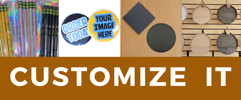 Get customized pencils, buttons, coasters, wood signs, & more!